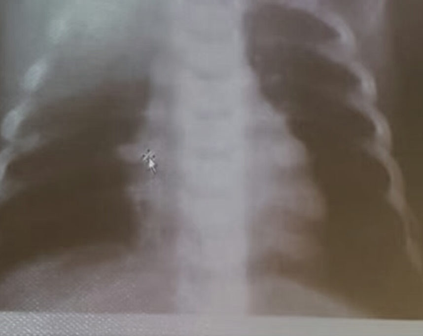- AP chest film showing the following; 1)- Laterally located Bilateral - (1 Opacities in both lungs indicating resolving ARDS, 2)- Bilateral hyper-lucent shadows in the Superior Mediastinum which resemble Butter Fly Wings indicating Bilateral Pneumomediastinum, 3)- Rim of air encircling the heart .and indicates Pneumopericardium
