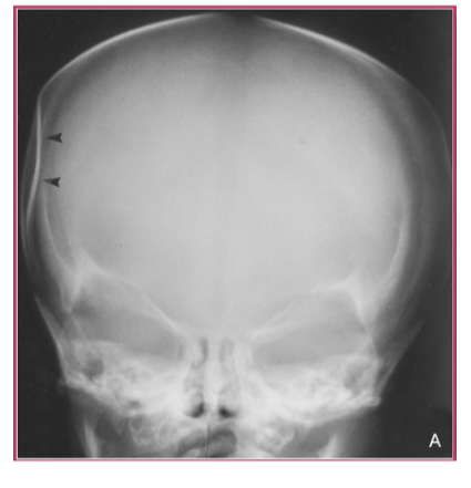- Conventional skull radiograph showing the typical depressed, ââping-pongââ fracture of the newborn.