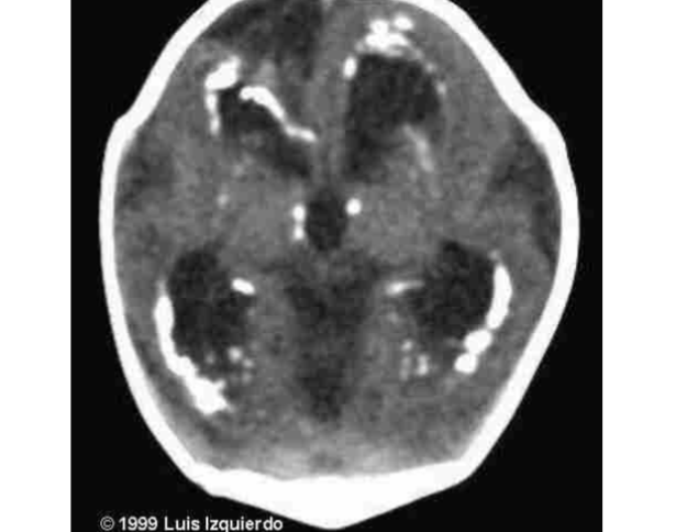 - ,There is symmetrical, bilateral, hyper-dense (whitish), rounded lesions - (1 :approximately 1.5 Ă 1.5 cm in diameter located in the basal ganglion regions