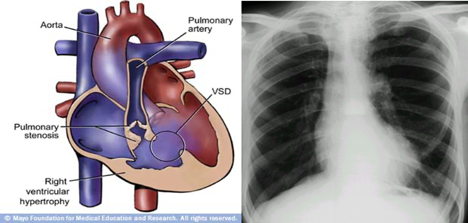 Tetralogy of Fallot On Clinical Exam SEM at 2nd ICS transmitted to back Single S2 Mild Cyanosis OR no cyanosis Not in distress ECG RVH RAD X-ray Boot shaped heart Dec PVM Right arch