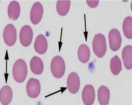 • Hb mildly decreased or normal, normal MCV, high MCH content.