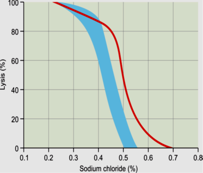 Fresh RBCs are incubated in hypotonic buffered salt solutions of various osmolarities, and the fraction of hemoglobin released (due to hemolysis) is measured. Spherocytic RBCs have reduced surface area to volume (SA/V) ratio.