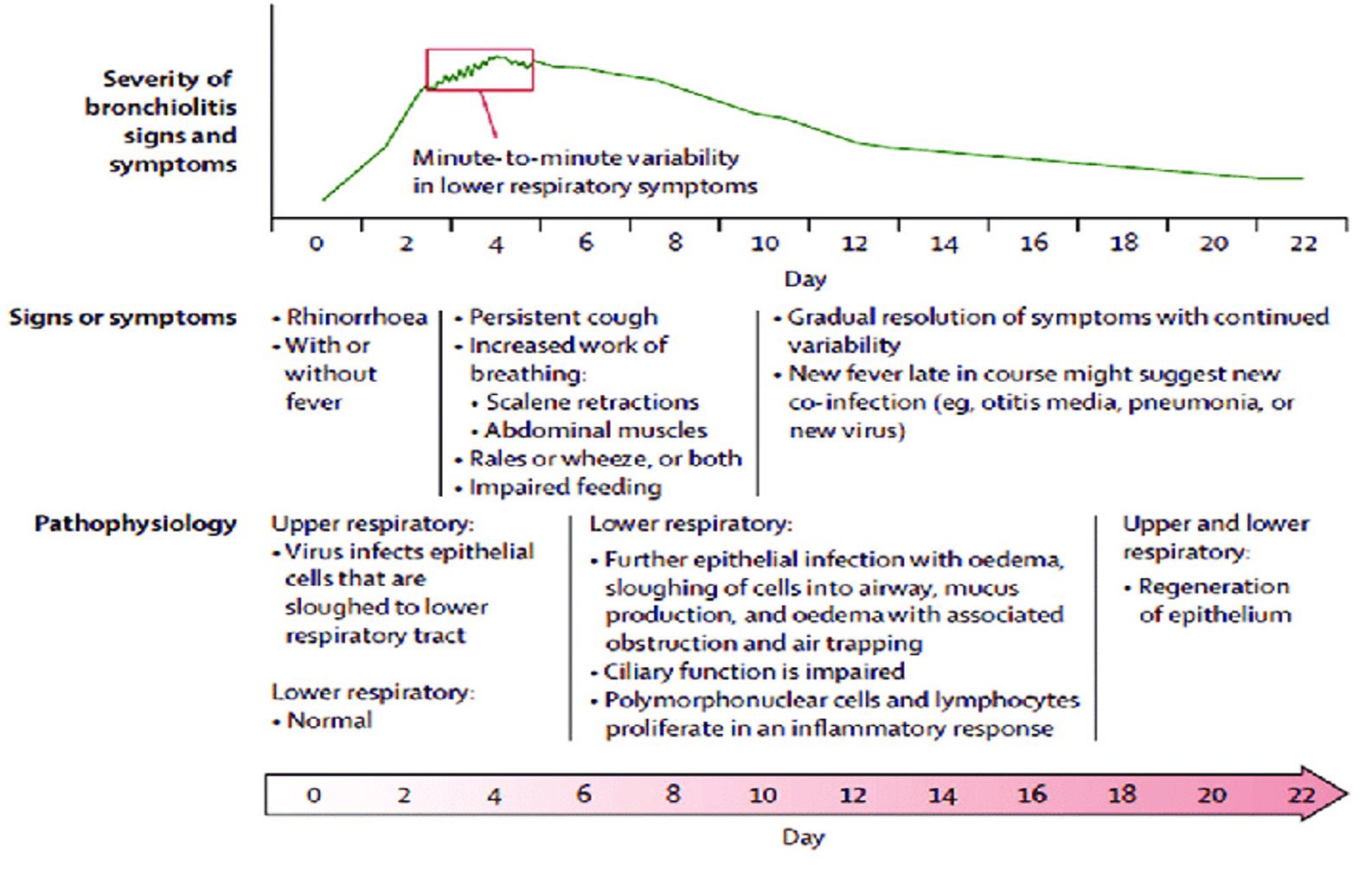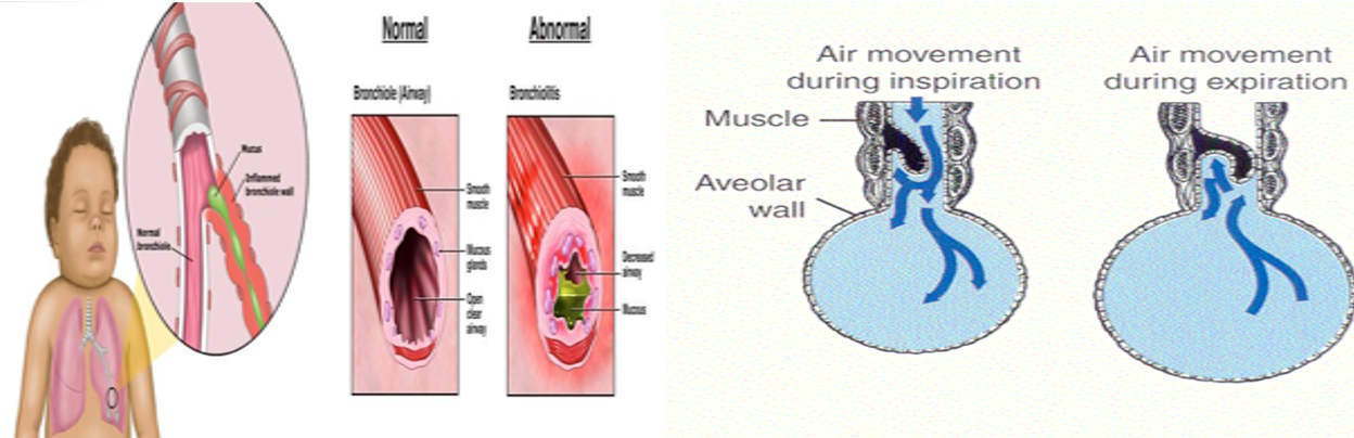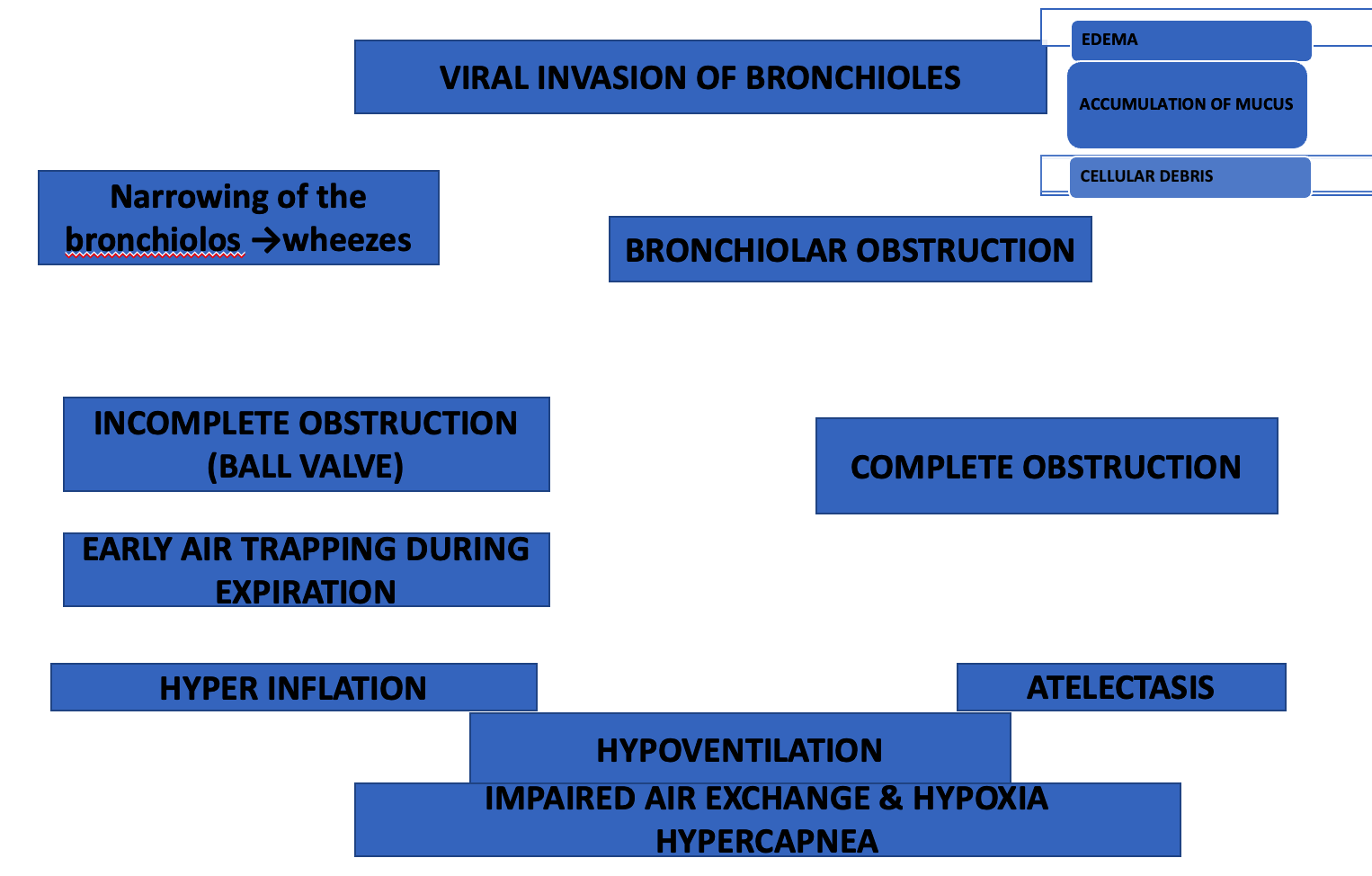 • Viral invasion of the smaller radicles of the bronchial tree → edema + accumulation of mucus and cellular debris → bronchiolar obstruction.