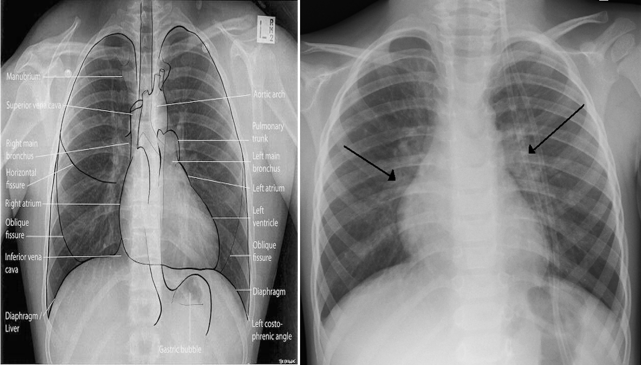 • An X-ray of a child with RSV showing the typical bilateral perihilar fullness of bronchiolitis.