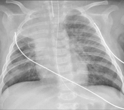 Chest radiograph of a 3-month-old infant with severe RSV bronchiolitis: demonstrating a collapsed right upper lobe, hyperinflated left lung and bilateral perihilar, peribronchial thickening. The patient is intubated and has a nasogastric tube in situ.