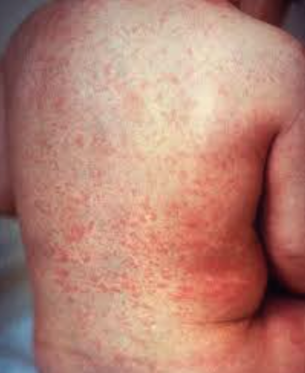 - Raised, red, pinpoint rash that starts on the face and spreads downwards, it lasts 3 – 5 days.