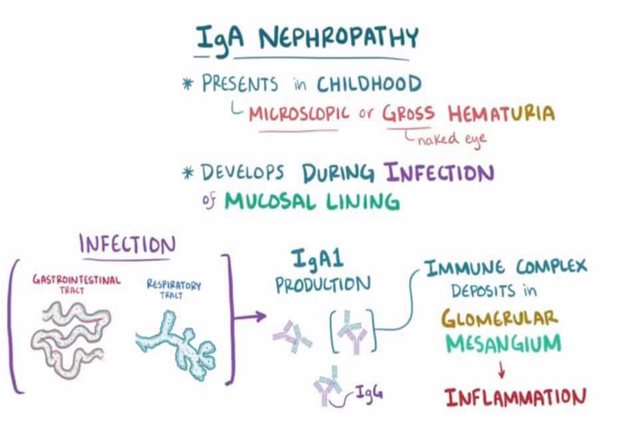 Presents with incidental finding of persistent microscopic hematuria or with an episode of macroscopic hematuria which is typically associated with concurrent upper respiratory infection or acute gastroenteritis– these episodes may be recurrent.