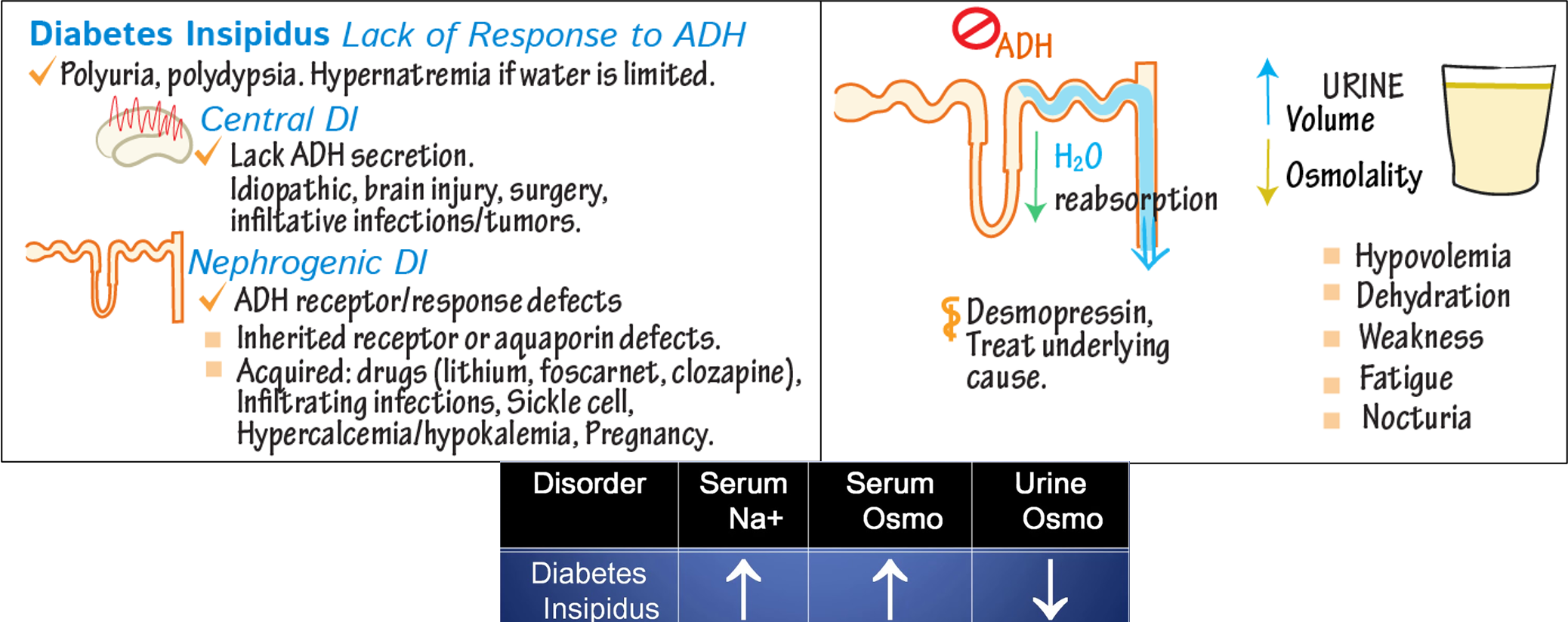 • Causes: Inherited receptor or aquaporin defects, acquired (drugs like lithium, foscarnet, clozapine), infiltrating infections, sickle cell, hypercalcemia/hypokalemia, pregnancy.