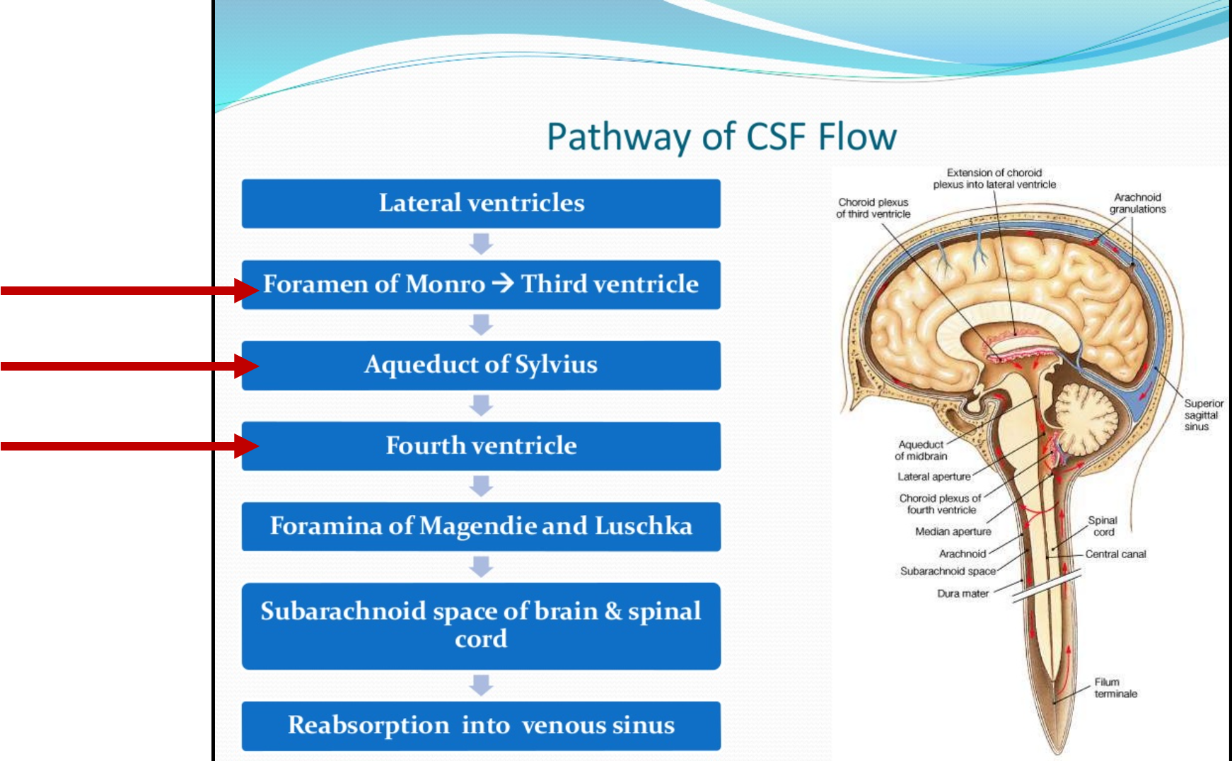 - CSF is produced in choroid plexus & spinal subarachnoid space (400-500 ml per day)