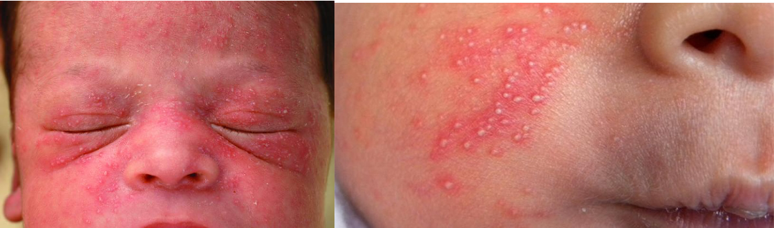 - Yellowish papulovesicular lesions surrounded with irregular surrounding erythema
