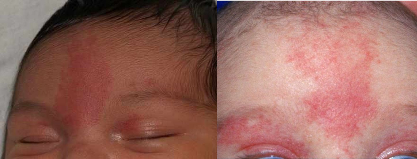 Known as nevus simplex, stork bite, or angel kiss Pale pink blanching macules and patches Usually fades by months up to 2 years but may become prominent with crying, or straining