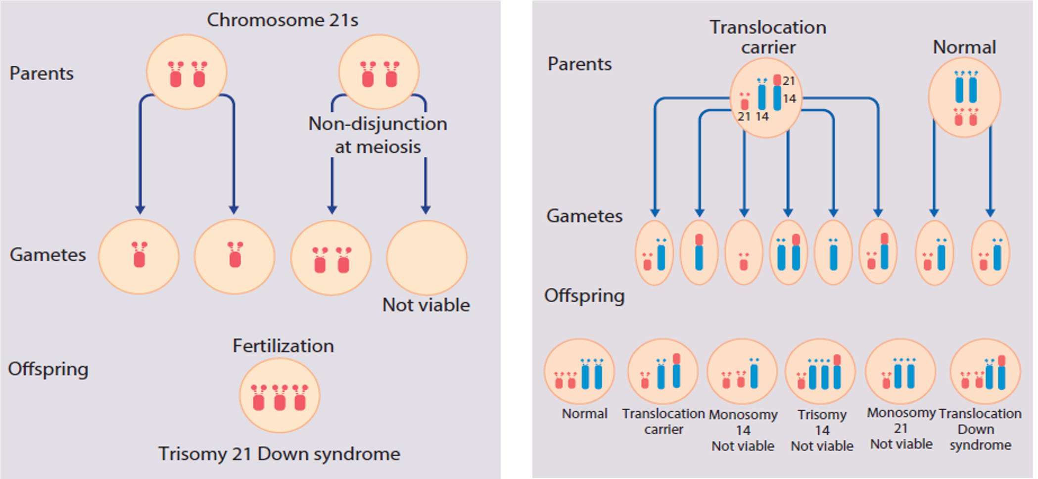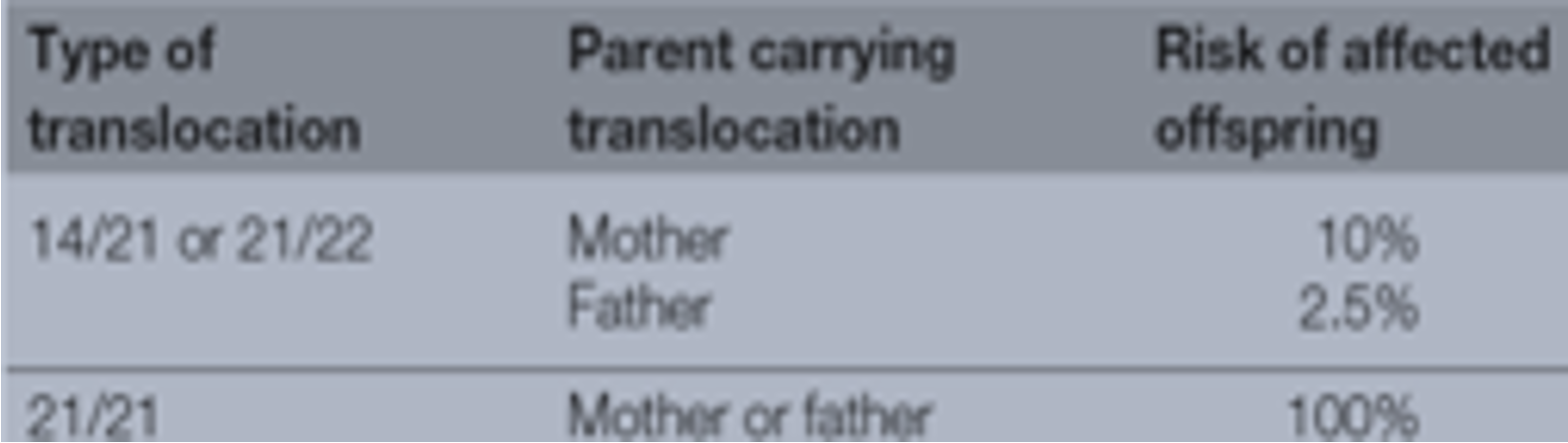 • Robertsonian Translocation: If the mother is a carrier of 14q:21q translocation, the risk is 15% with amniocentesis and 10% for a liveborn child with Down Syndrome. If the mother is 21q:21q translocation, the risk of recurrence is 100%.
