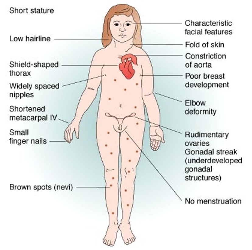 45,X karyotype (about two thirds are missing the paternal X chromosome)