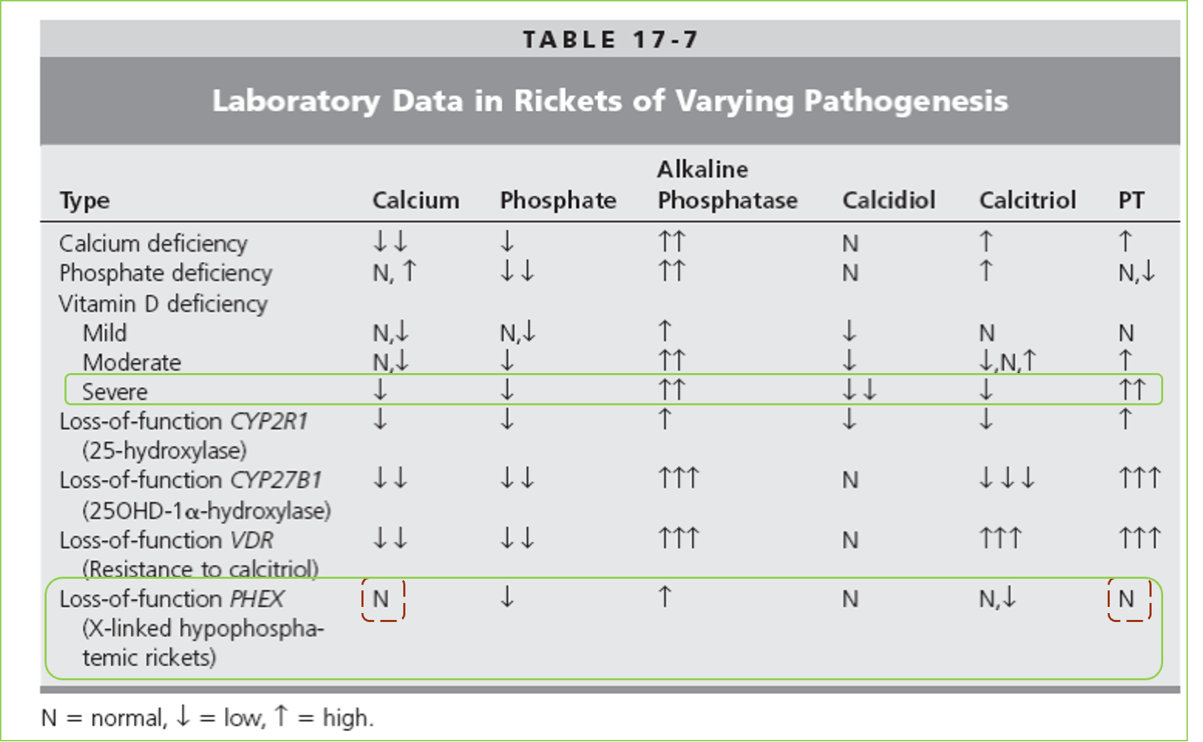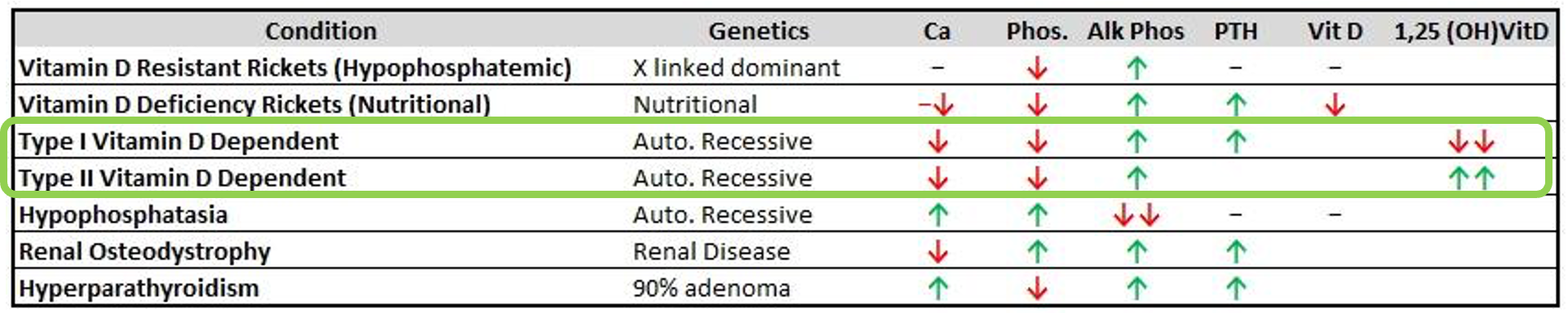 - Alkaline phosphatase (level is raised when hypocalcemia is secondary to a disorder of vitamin D) & (level is in the normal range when hypocalcemia is secondary to hypoparathyroidism)