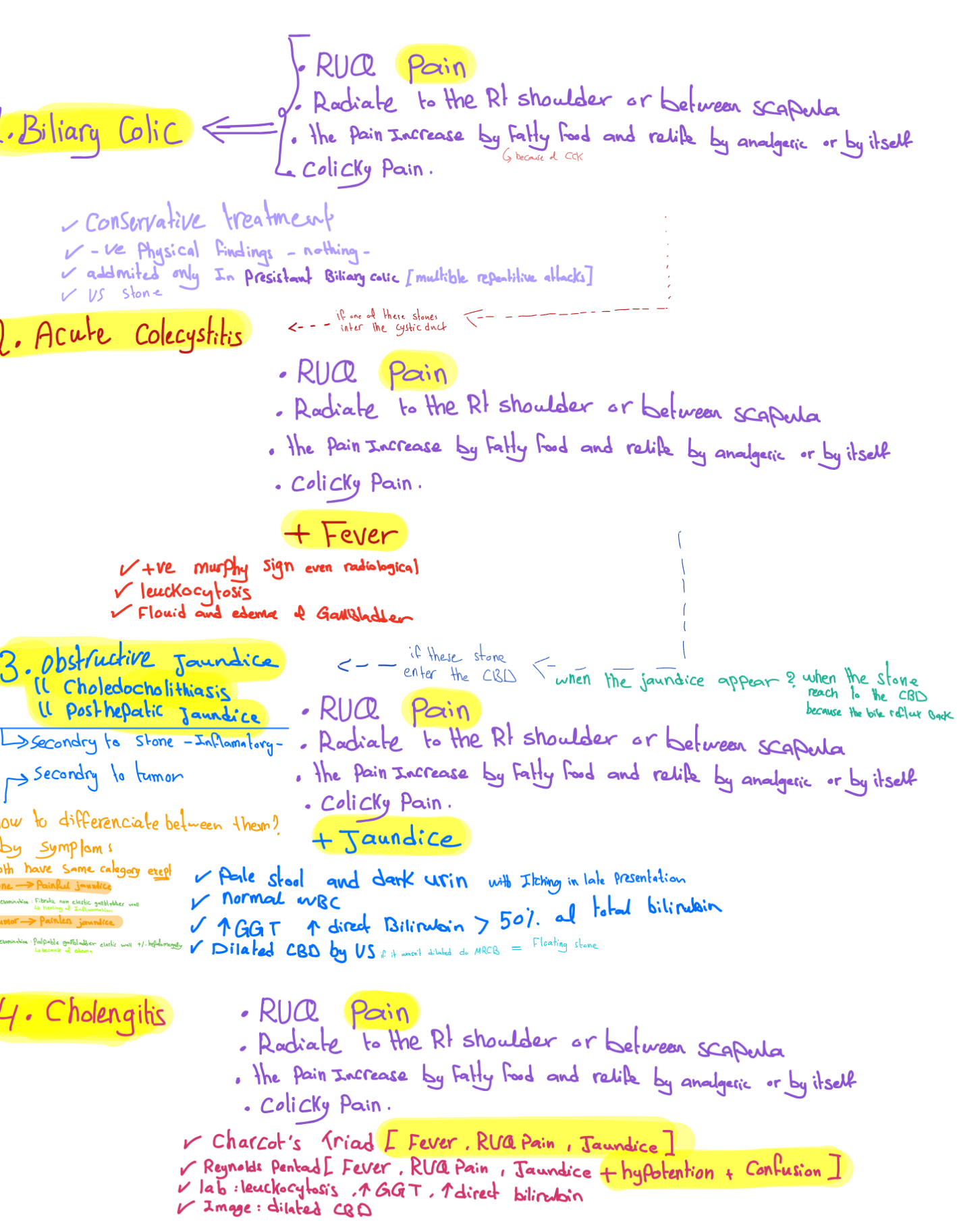| RUQ | Hepatobiliary | Biliary colic, Cholecystitis, Cholangitis, CBD obstruction (stone, tumor), Hepatitis, Budd-Chiari, Hepatic abscess/mass, Right subphrenic abscess |