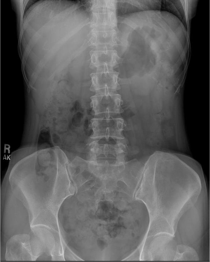 normal abdominal x-ray - normal gas pattern - lower pole kidney - gastric bubble is found - comment on bone