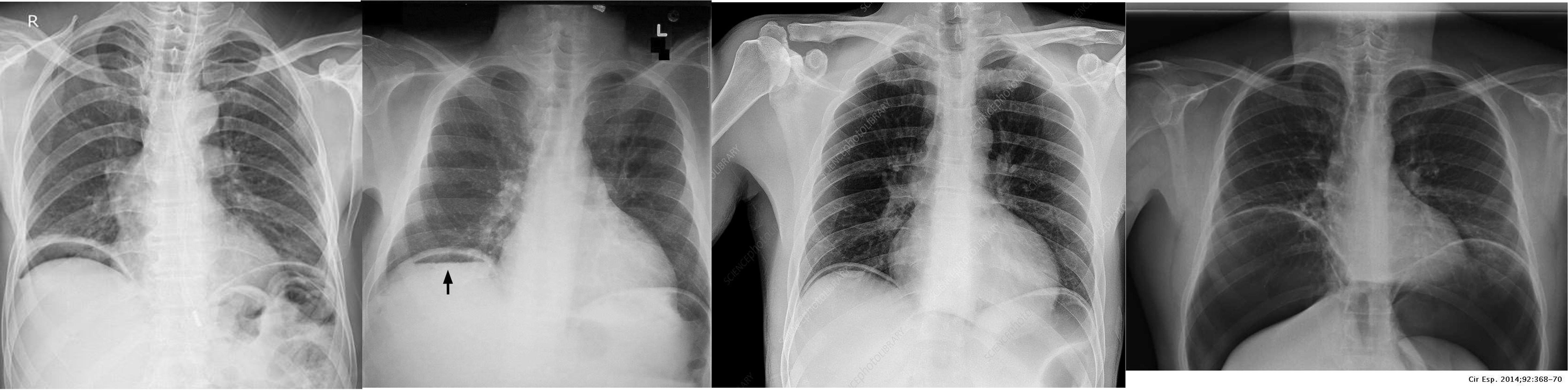 Free air under diaphragm - most commonly due duodenal perforation - (diff; perforated viscus, peptic ulcer, duodenal, penetrating truama, post surgical 8 days likely to disappear)