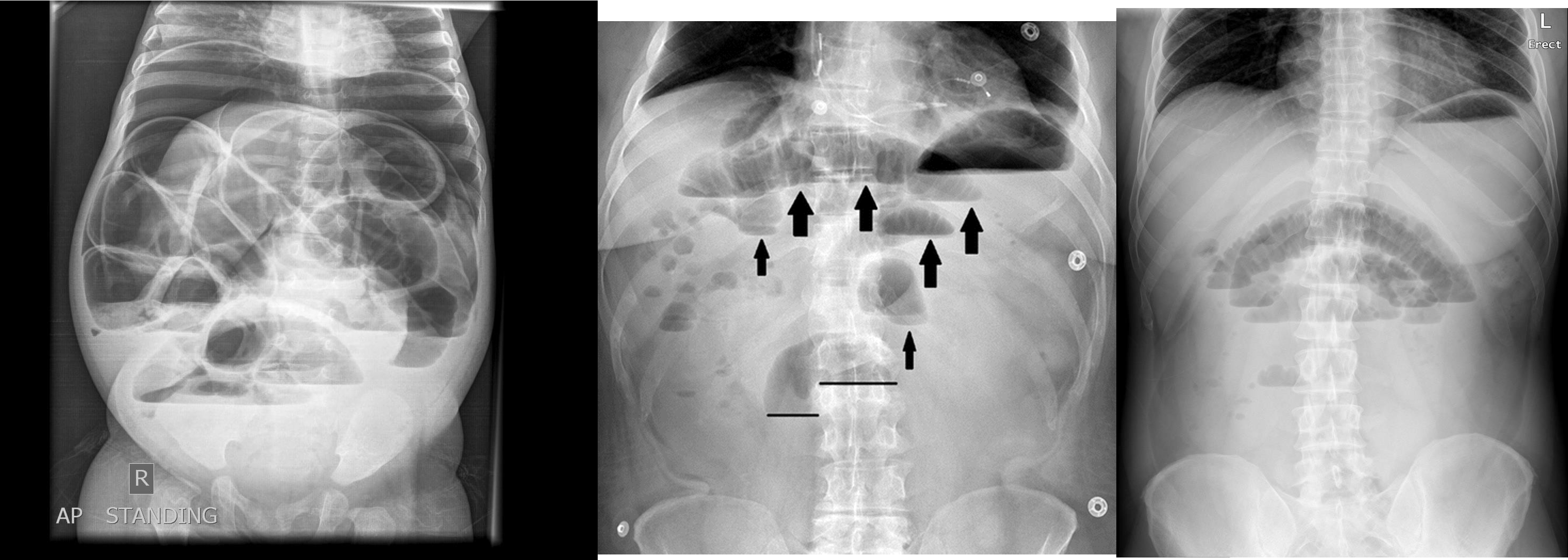 - no free air under diaphgram - 8 fluid level, (evidence of bowel obstruction) (adhesion, hernia, IBD; Crohn, cancer, inturcucception, gallstones)