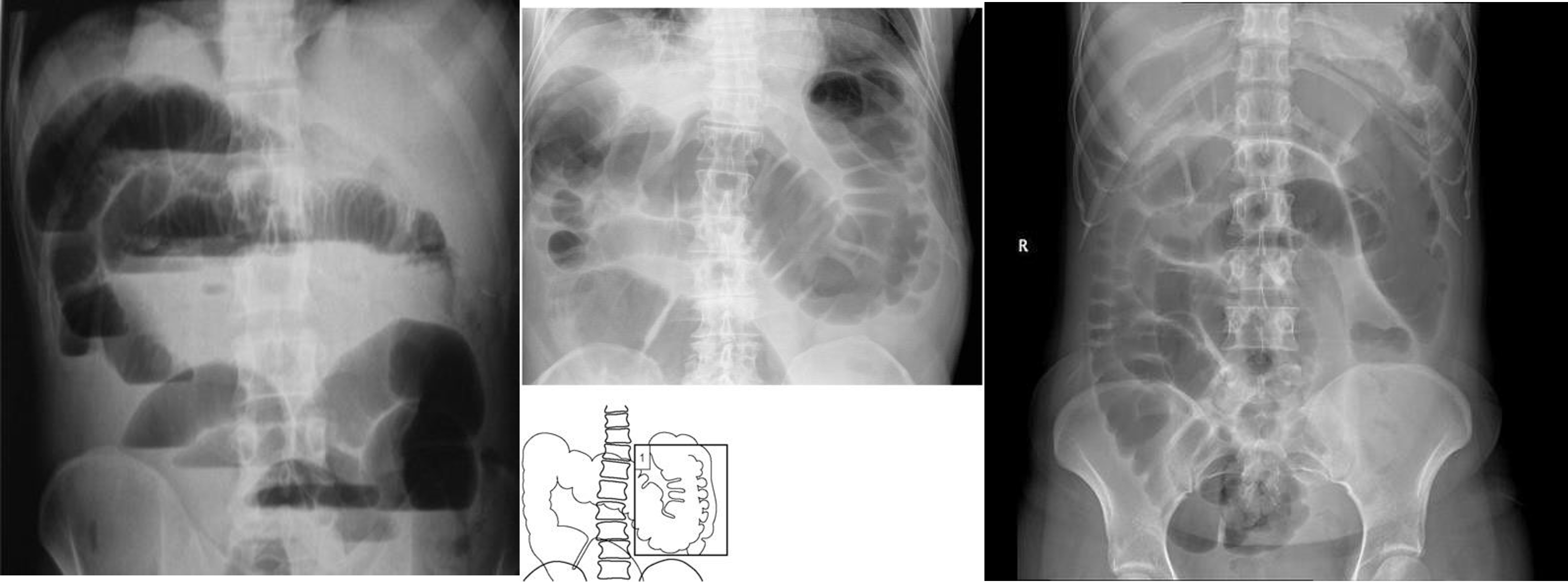 2) Dilated bowel (diff; cancer colon) -