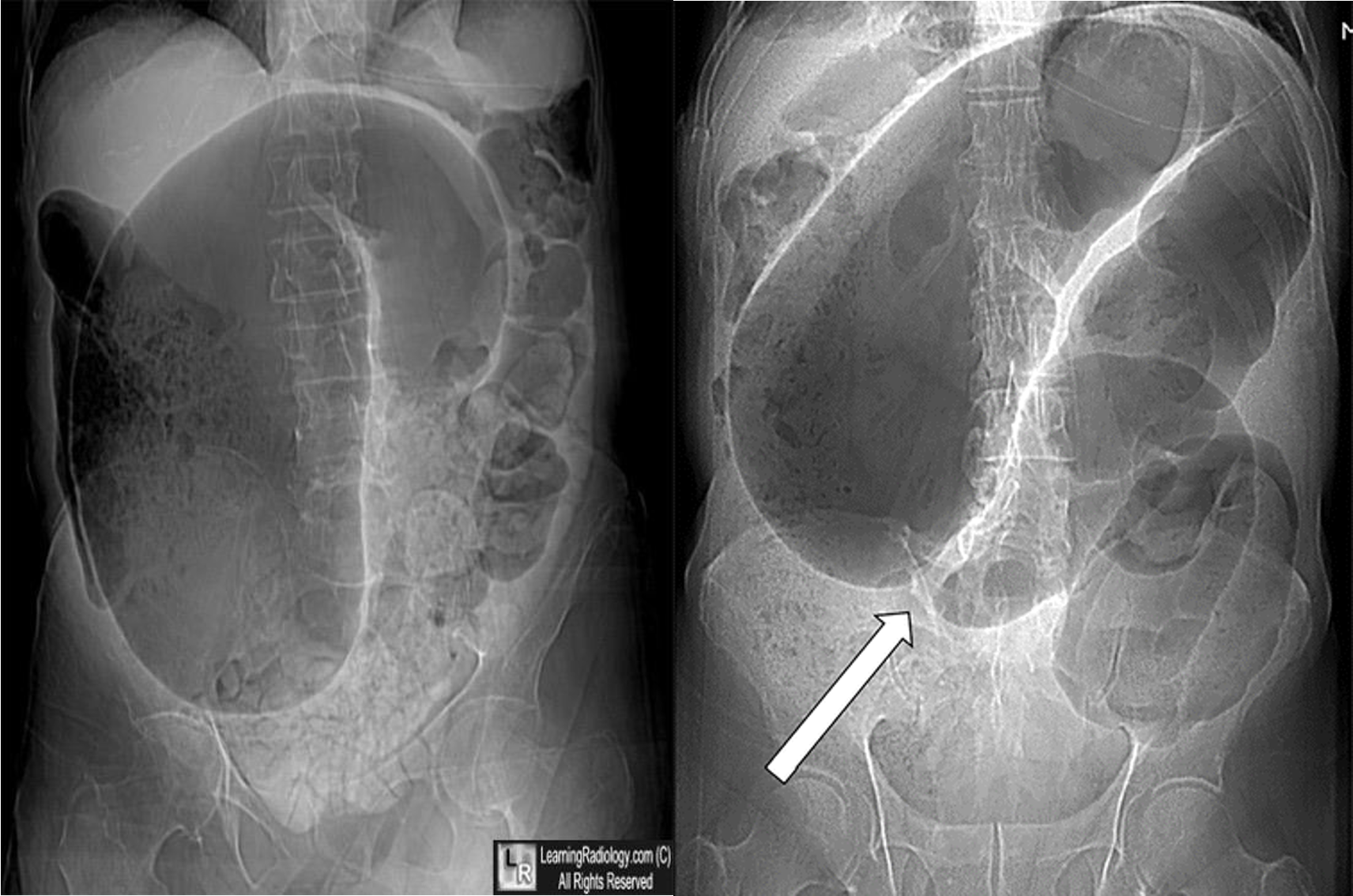 - dilated large bowel - mucosal folds are not complete - (diff; cancer, divertuclitis, volvolus, toxic megacolon?)
