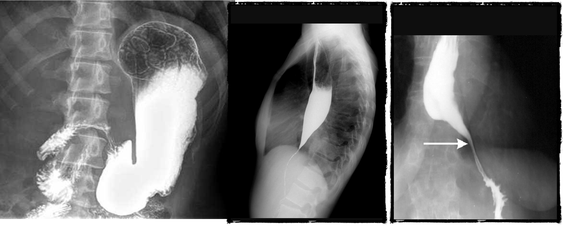 - dilated esophagus, stricture, bear beak/rat tail sign = aclasia