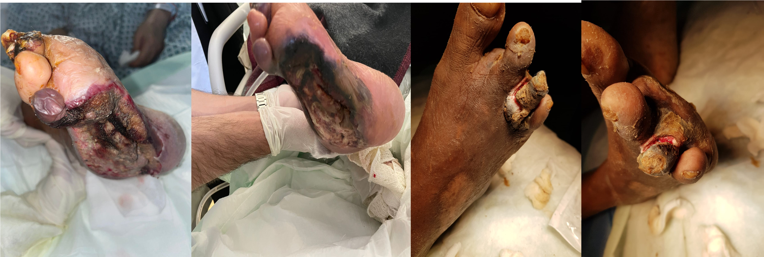 Black discoloration involving distal medially foor represent gang, no obvious discharge, foot is edematous, edematous, no hair, muscle wasting…