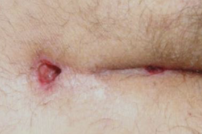 A view lower back young male who complained discomfort & recurrent purulent discharge