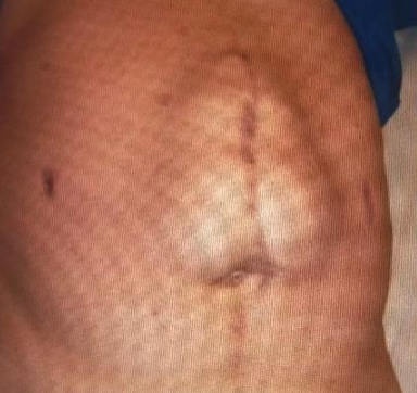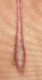 A young female was seen with this scar 3-month post abdominal surgery.