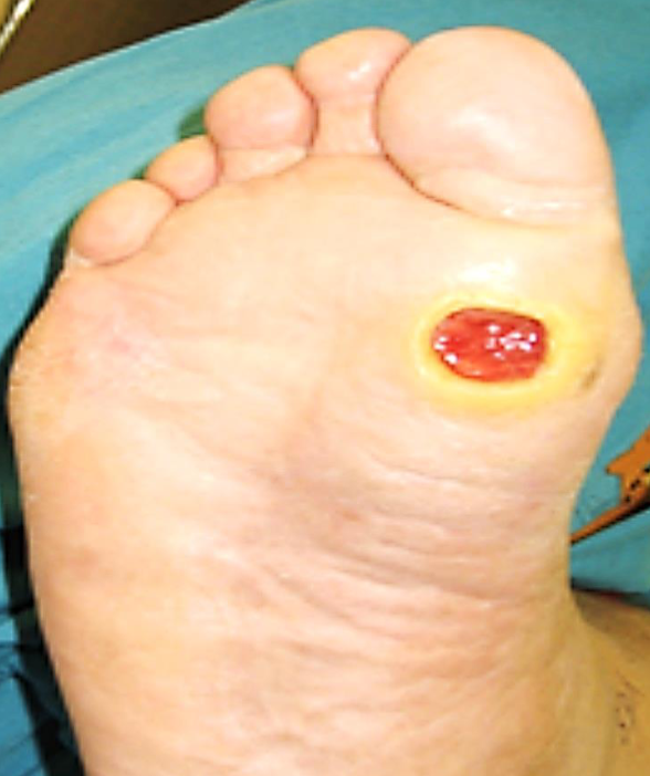 Ulcer over plantar surface of right foot just below big toe - most likely is trophic ulcer
