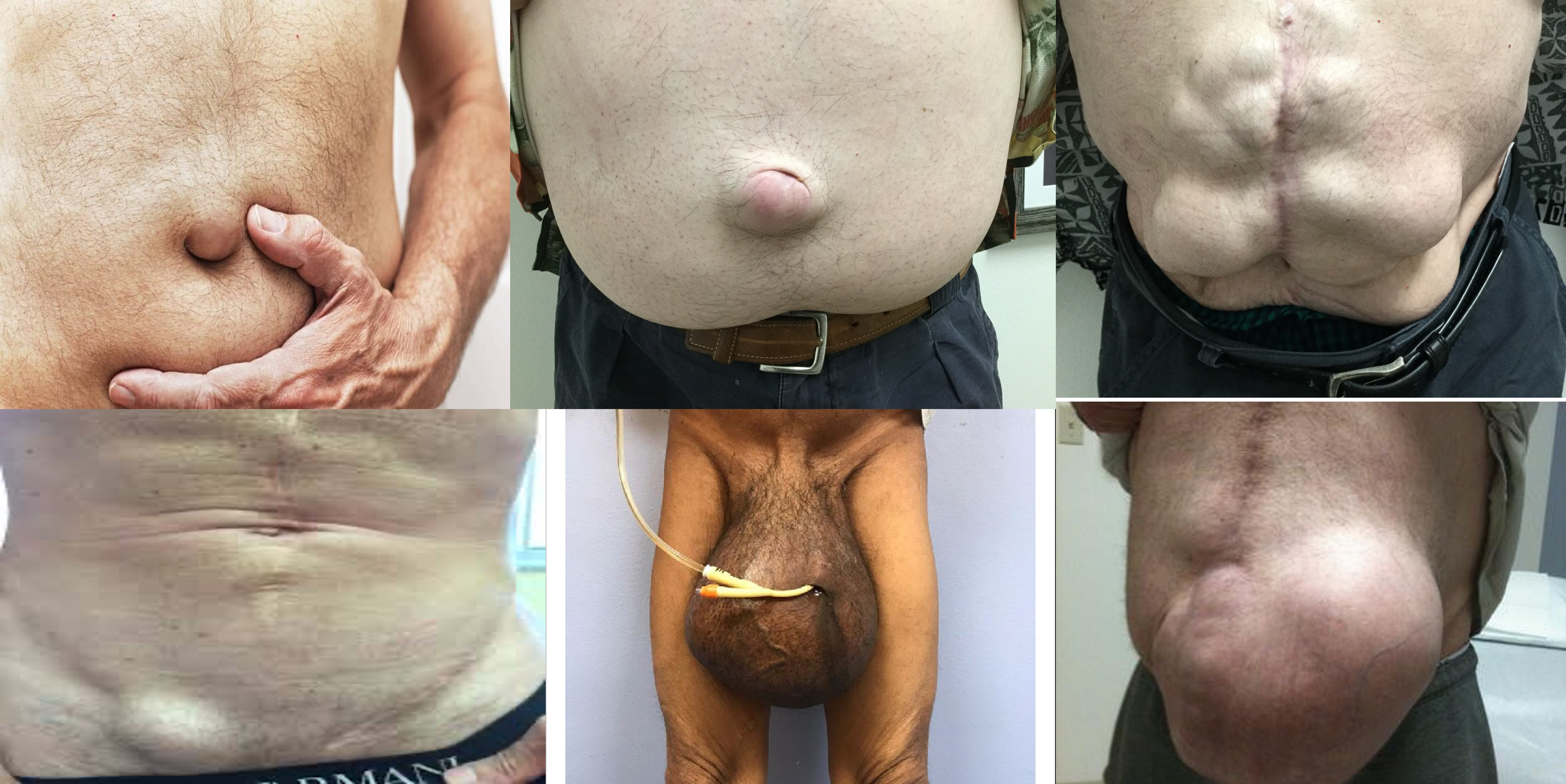 - Midline scar, RT inguinal swelling/mass/lump, LT inguinal scar. - diff?