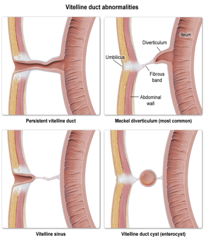 1. Persistent vitello-intestinal duct: Persistent part- Meckel’s diverticulum.
