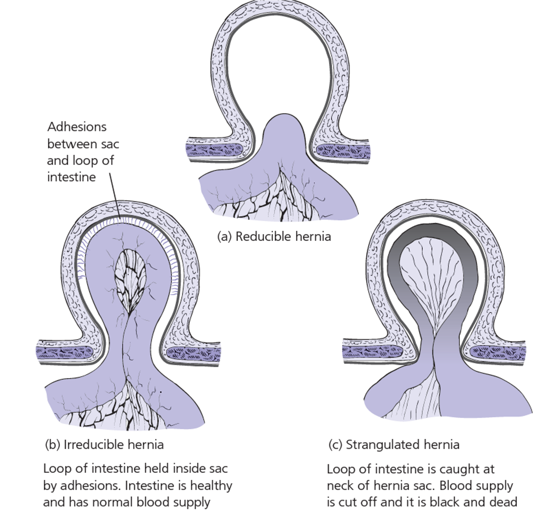 - Incarcerated: Hernia contents are irreducible due to adhesion. May obstruct or strangulate.