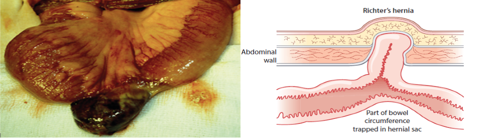 Richter’s hernia: Z Partial thickness of bowel trapped within sac leads to partial bowel obstruction with vomiting but the patient continues to pass flatus. (contents of mickel’s diverticulum colon)