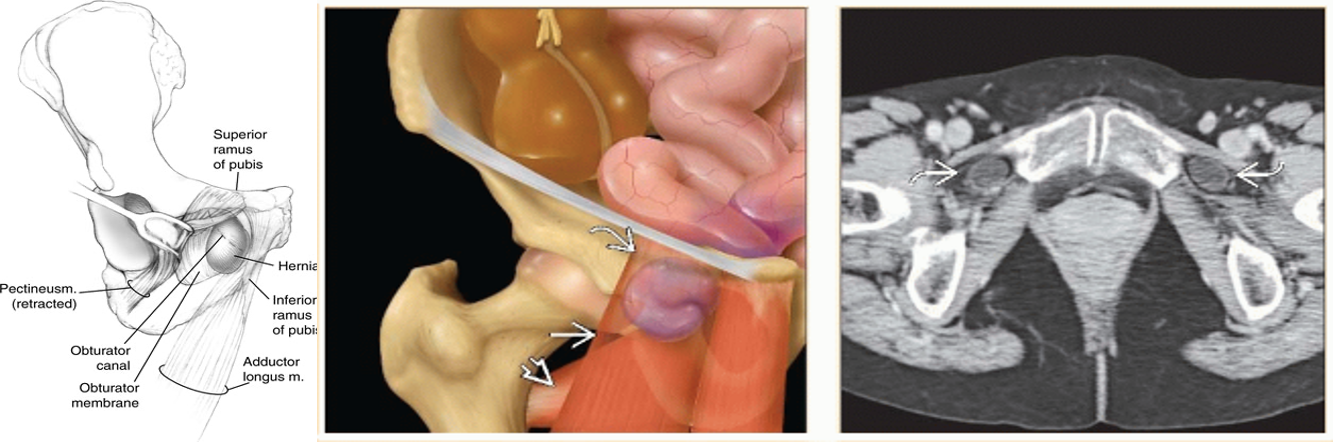 Obturator hernia: through obturator canal. Common in female. Diagnosis- usually at laparotomy for intestinal obstruction due to strangulated hernia.