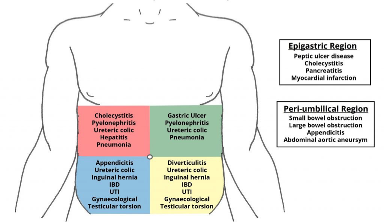 | Diffuse | Gastrointestinal | Peritonitis, Early appendicitis, perforated appendicitis, Mesenteric ischemia, Gastroenteritis/colitis, Constipation, Bowel obstruction, Pancreatitis, Inflammatory bowel disease, Irritable bowel syndrome, Ogilvie’s syndrome |