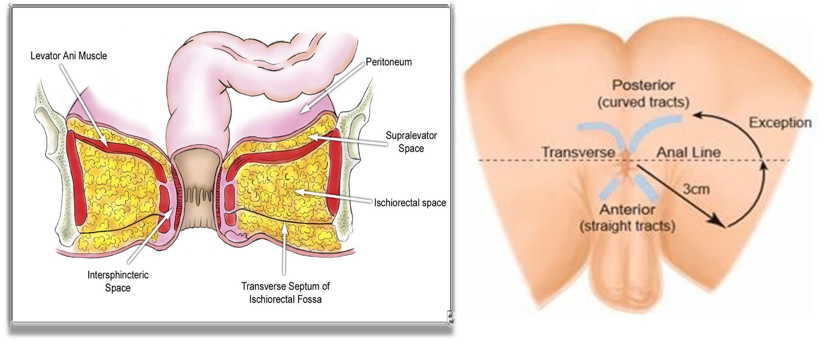 - Fistulas with external openings posterior to this line will follow a curved course to the posterior midline (horseshoe)