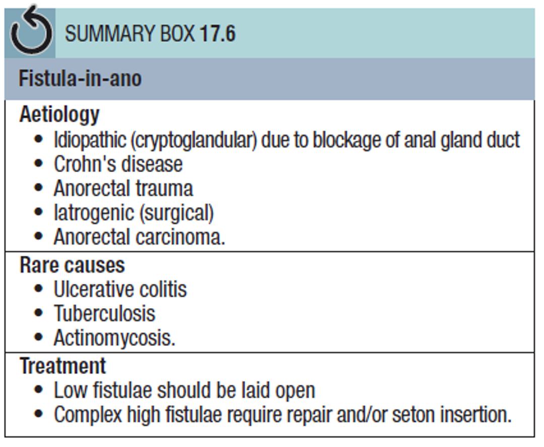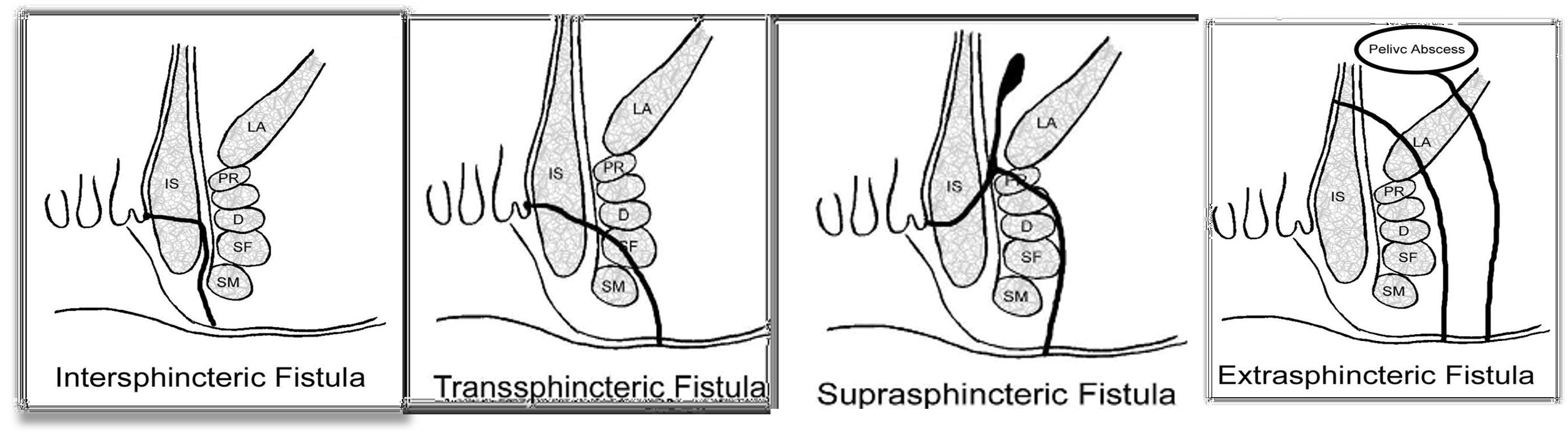 | Extrasphincteric | Foreign body penetration of the rectum, penetrating injury to the perineum, Crohn disease, Cancer, pelvic inflammatory disease | Tracking upward and through the levator ani muscles to the rectal wall, completely outside the sphincter mechanism |