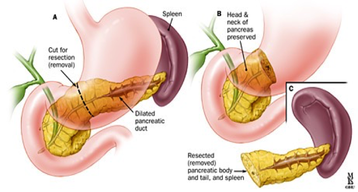 Tumors involving the body or tail of the pancreas are removed by distal pancreatectomy and splenectomy.
