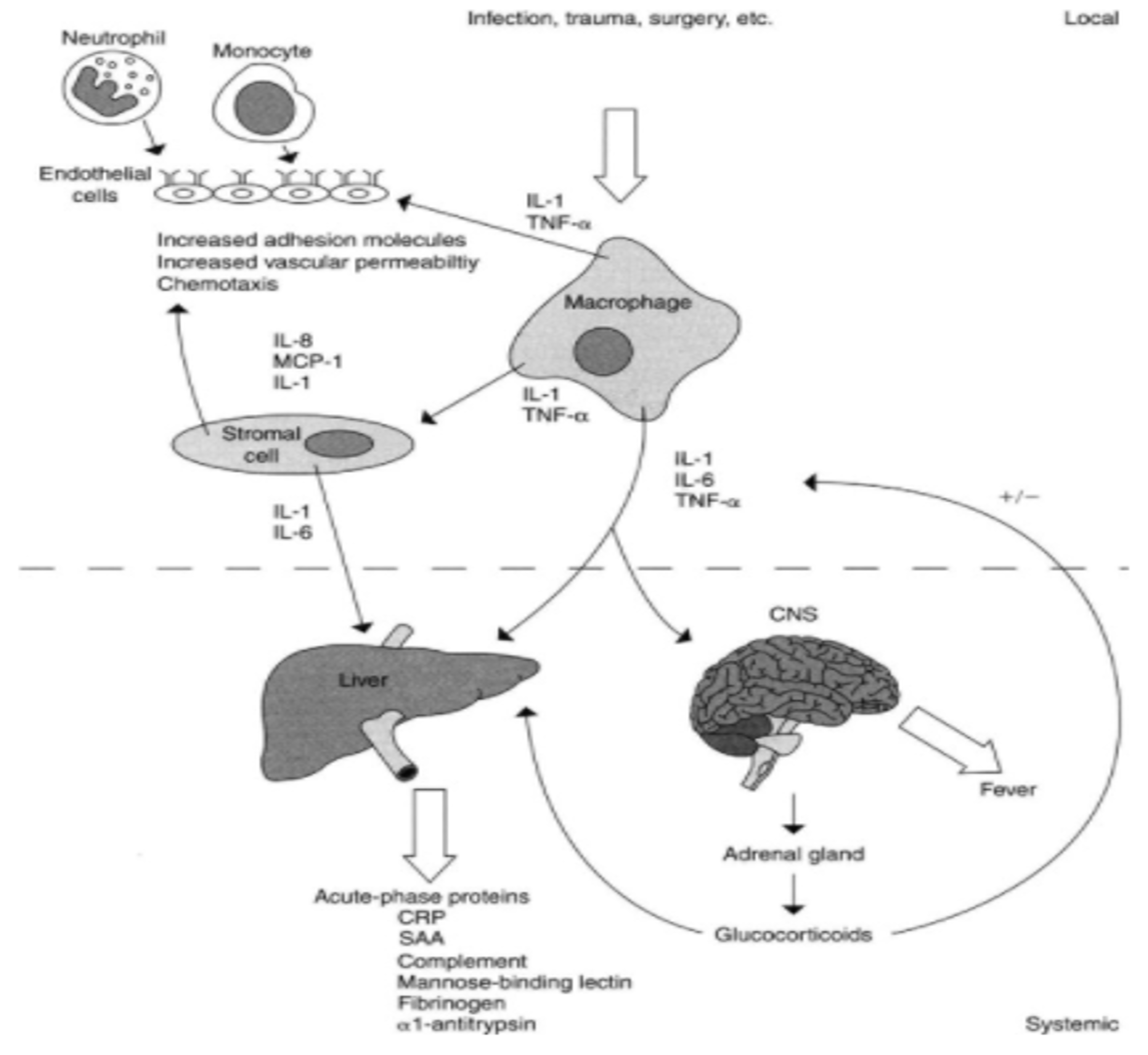 The acute-phase response is mediated by pro-inflammatory cytokines (notably IL-1, IL-6 and TNF-α) Its function is in host defence and the promotion of healing.