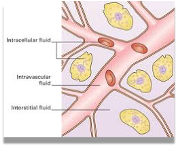 Intracellular 40%, Extracellular 20% Interstitial: 15% Intravascular: 5%