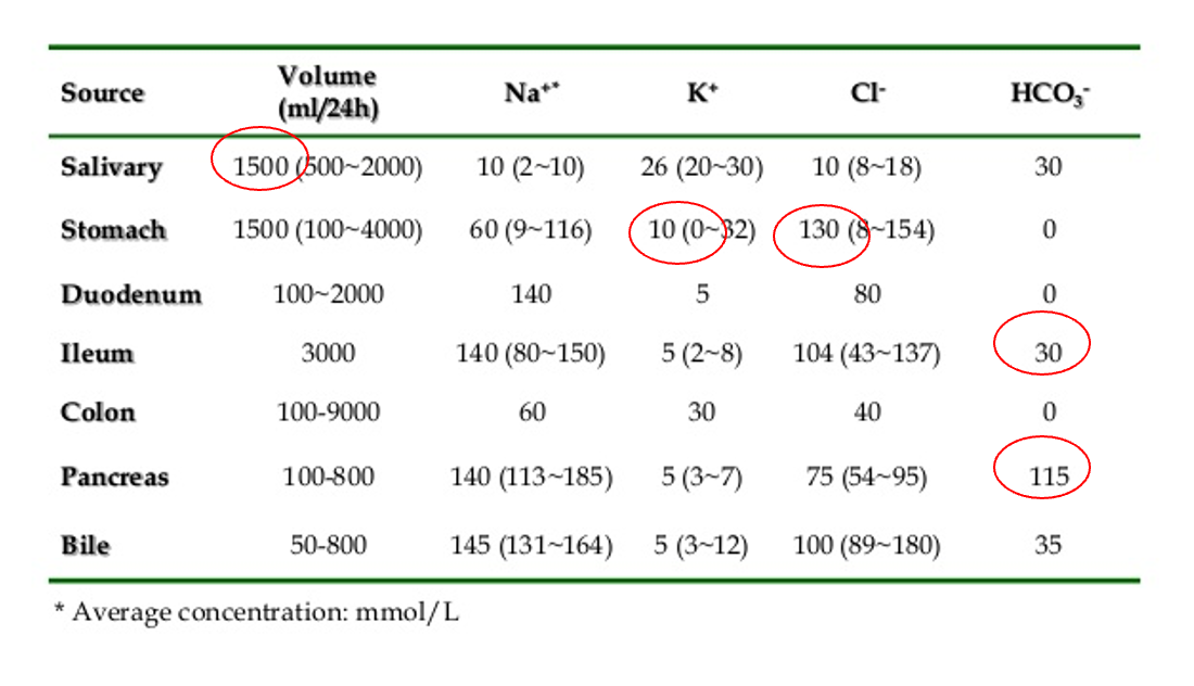 - Extra-cellular Cation “Na” , Anions: “Cl” “Hco”
