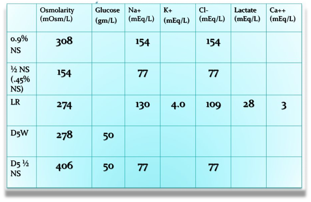 - No Dextrose: to avoid hyperglycemia (except hypoglycemic attack)