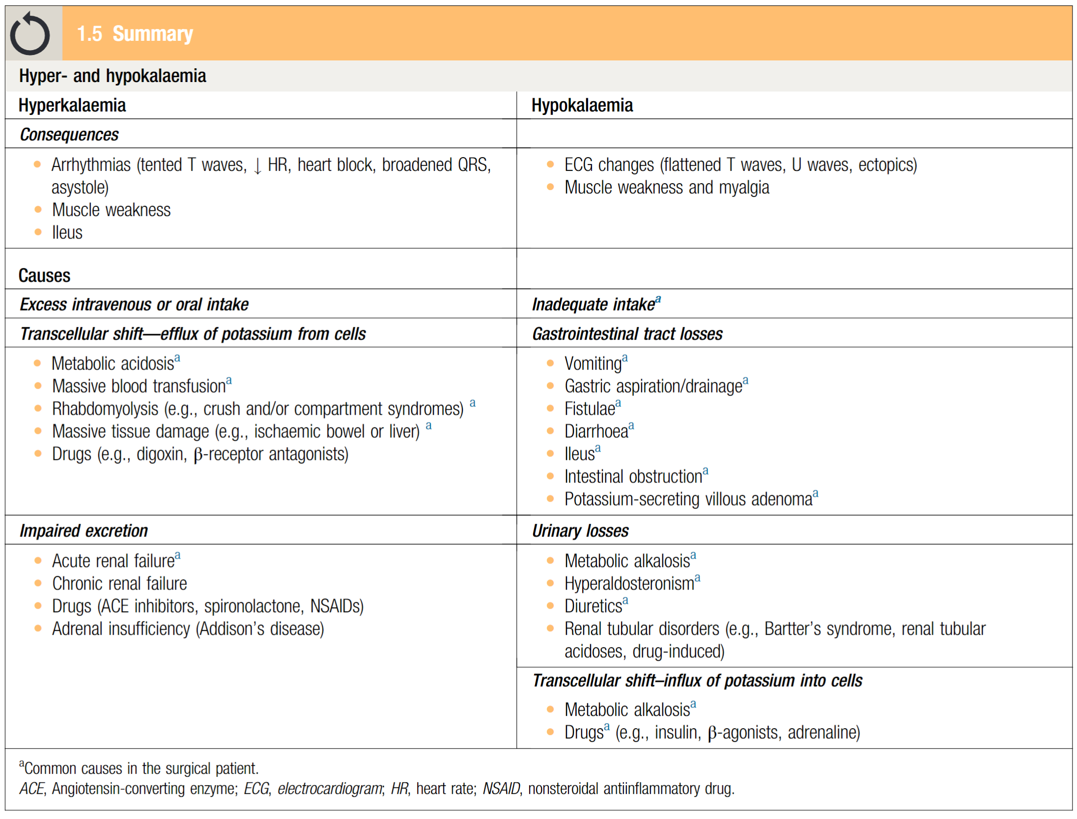 This is a potentially life-threatening condition that can be caused by exogenous administration of potassium, the release of 1 Fluid and electrolyte balance • 15 potassium from cells (transcellular shift) as a result of tissue dam- age or changes in the Na + /K + -ATPase function (e.g., acidosis), or impaired renal excretion.