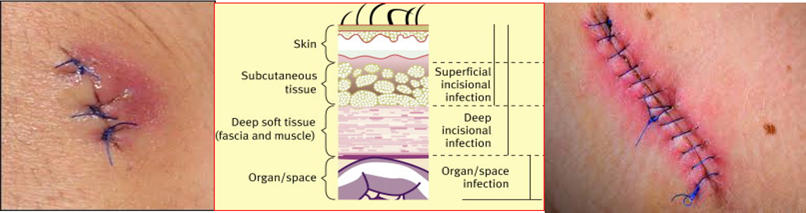 Sup.SSI- Local signs: erythema, oedema, discharge and pain Treatment: antibiotics & remove suture/clips and drainage of pus (ClS).