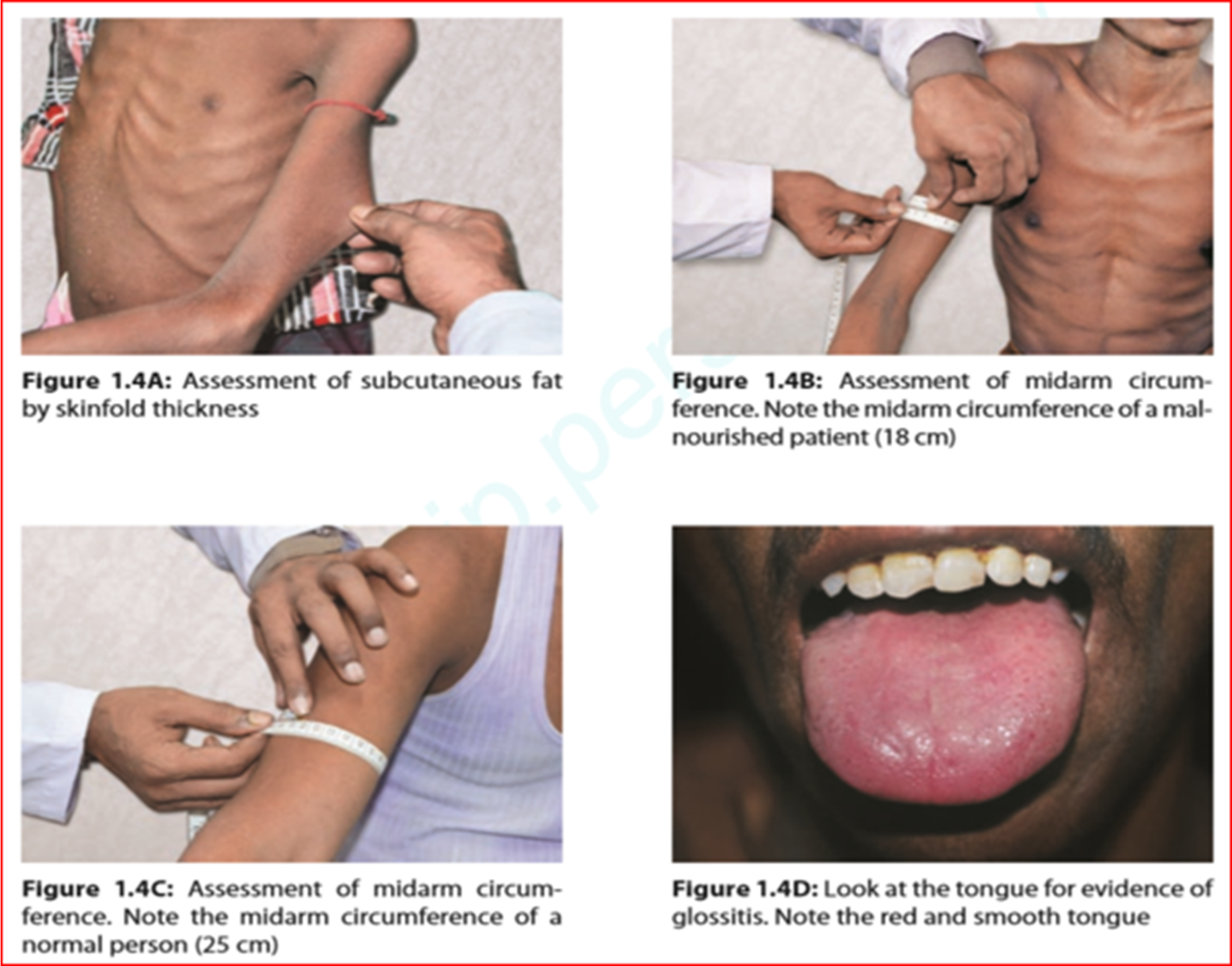 Triceps skinfold thickness (TSF)— Subcutaneous fat accounts for about 50 percent of the body fat stores and accurately reflects the total body fat content, measured with a large skinfold caliper while the patient is standing or sitting with the right arm hanging loosely at the side, just below the midpoint between acromial and olecranon processes. If below 10th percentile or a visible loss of subcutaneous tissue on physical examination indicates fat store depletion. N=(M: 18.7+_8.5mm, F=23.6+_7.5mm)