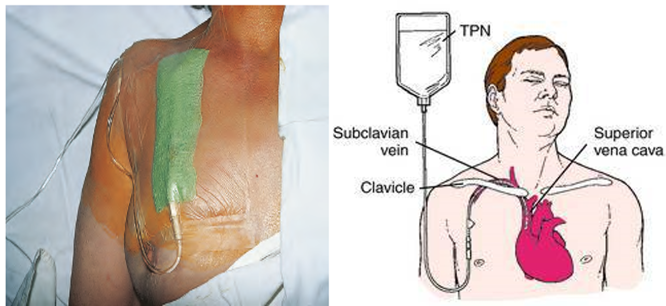 TPN or CVN (Central venous route), when chosen, the catheter should be inserted via(access) either the subclavian, internal or external jugular vein and is tunneled subcutaneously to minimize the risk of infection.