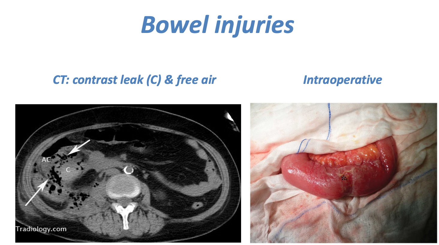 (Image: Bowel injuries CT: contrast leak (C) & free air Intraoperative)