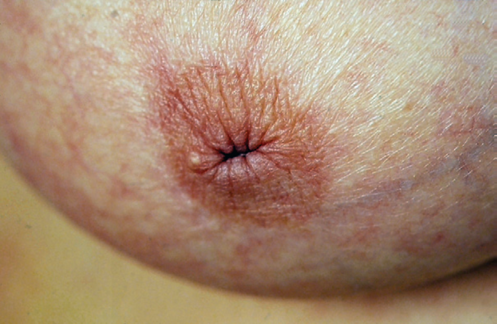 (contrasts with breast cancer, in which the whole nipple is pulled in)