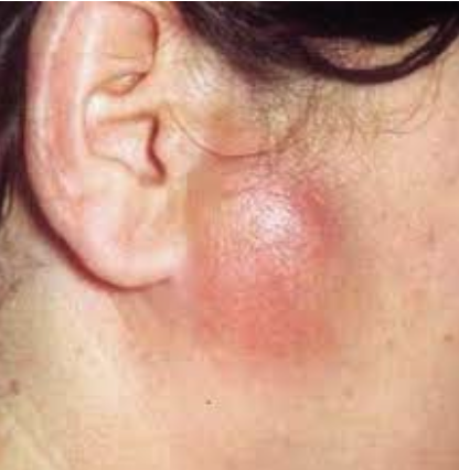 - Tender parotid swelling with fever and malaise