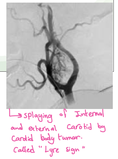 What is Lyre sign in CT scan? angiogram - most likely carotid body tumour